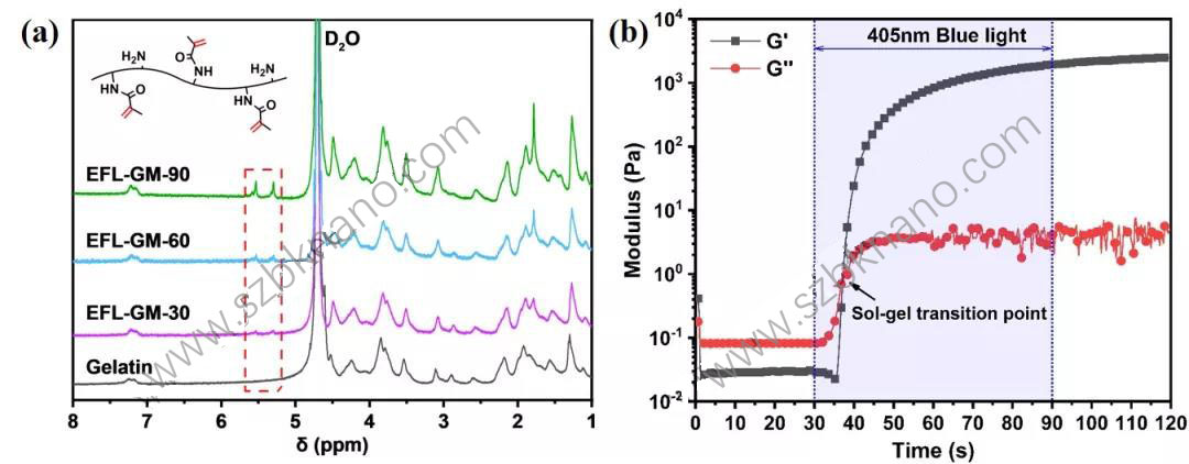 圖1 (a)三種型號GelMA核磁普;(b)GelMA(GM-90)光固化過程流變分析