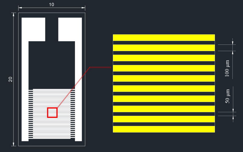 2.線寬100um,線距50um,指長6.3mm。叉指對數(shù):25對(50指)。