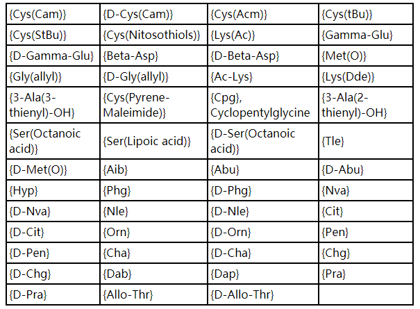 Nitro-Tyrosine(硝基酪氨酸), Norleucine (正亮氨酸,Nle), Pyro-Glutamic acid (焦谷氨酸,Pyr),