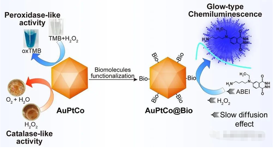 其他說明:密封狀態(tài)下保質(zhì)期半年【主要優(yōu)勢】1、利用金、鉑、鈷元素之間良好的電荷轉(zhuǎn)移和協(xié)同效應(yīng),AuPtCo表現(xiàn)出比HRP和其他人工納米酶更強(qiáng)的催化活性,可以催化ABEI-H2O2反應(yīng)產(chǎn)生閃光型CL發(fā)射;2、AuPtCo表面的生物功能化(AuPtCo@Bio)已經(jīng)證明了對延遲CL發(fā)射的緩慢擴(kuò)散效應(yīng)。