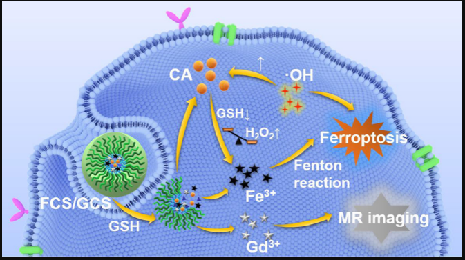 組成:兩親性聚合物骨架(P-SS-D)+肉桂醛前藥(CA-OH)+鐵離子(Fe3+)/釓離子(Gd3+)+多酚