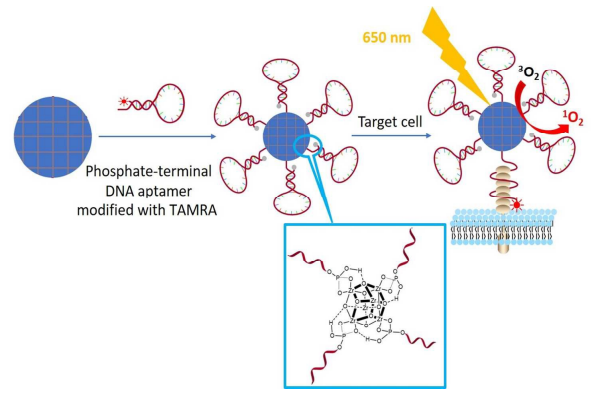 其他說明:密封狀態(tài)下保質(zhì)期半年【主要優(yōu)勢】通過固相DNA制備的磷酸根末端適體,通過磷酸根與鋯之間的強配位錨固在ZrMOF納米顆粒的表面上;赯rMOF納米粒子的π–π堆積誘導的TAMRA猝滅,由于適體與靶標結合后結構發(fā)生變化,因此可以實現(xiàn)靶標誘導的成像。具有靶標結合能力的適體-綴合的ZrMOF納米顆粒顯著增強了光動力治療效果。