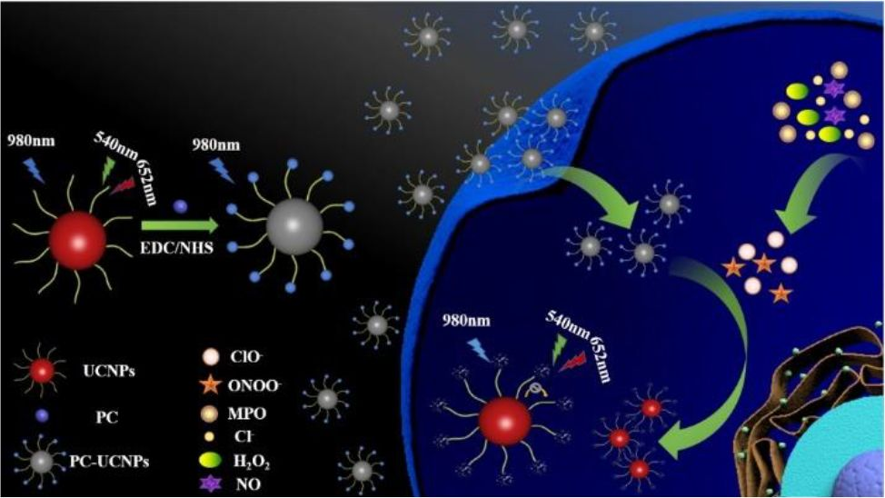 其他說明:密封狀態下保質期半年【主要優勢】1、實驗通過酰胺化反應將PC接枝到UCNPs表面,PC可通過能量傳遞來抑制UCNPs的發光。同時,該探針也可用于對MPO的生物活性進行評價;2、實驗也以急性肝損傷小鼠為模型,證明了基于PC-UCNPs的納米探針可以成功地被應用于對活細胞和炎癥過程中的MPO進行生物成像。