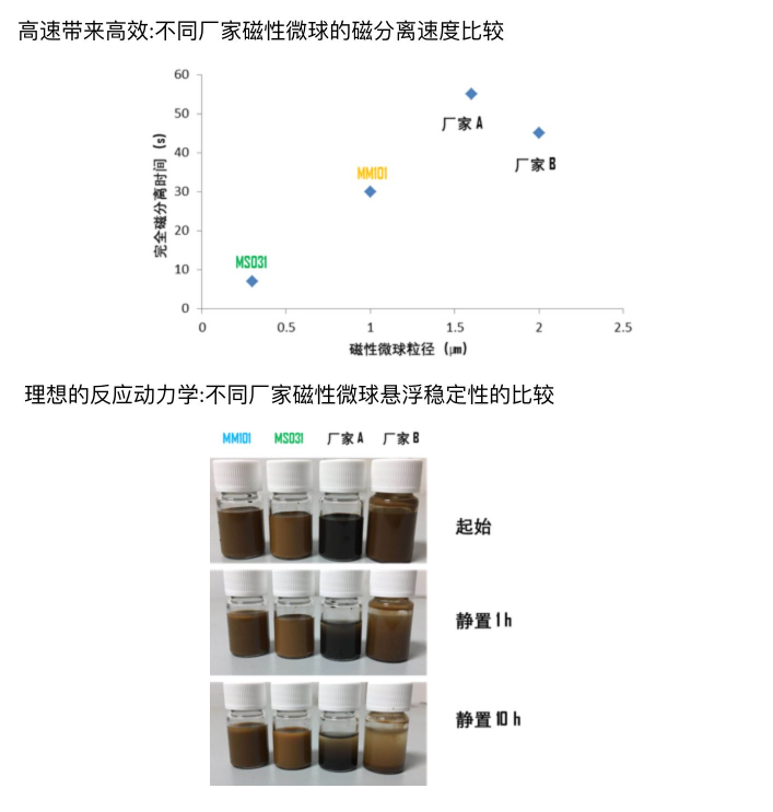 Stability: Stable dispersion in the range of 1-13 pH (Note: long time in an over-acid environment, the magnetic particles may be acid decomposed due to the penetration of hydrogen ions into the microspheres), and it can be used for a long time without an external magnetic field Stable suspension, greatly improving reaction efficiency