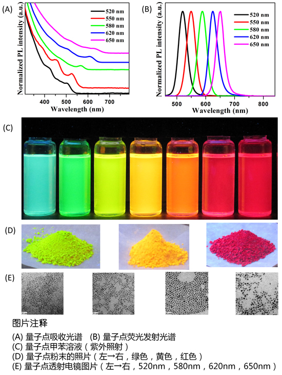 The oil-soluble CdSe/ZnS quantum dot products produced by Suzhou Beike Nanotechnology Co., Ltd. are based on CdSe as the core, ZnS as the shell, and core/shell fluorescent nanomaterials coated with hydrophobic ligands. The average quantum yield is 80 %. Avoid direct sunlight during storage and keep in a dark place sealed at 4 degrees. Products with different wavelengths from 480nm to 650nm can be customized for customers. This product has the characteristics of uniform particle size, wide absorption spectrum, narrow and symmetrical emission spectrum, and high and stable fluorescence intensity. It is especially suitable for the green and red components of quantum dot light-emitting diodes (QLEDs). It can be applied to solar cells, Light-emitting devices and bio-fluorescence labels and other fields.
