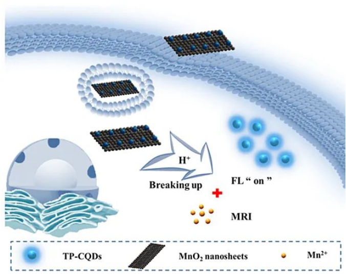 Raw material: two-photon carbon quantum dots (TP-CQDs) + MnO 2 nanosheets excitation / emission wavelength: 392 / 439nm Application: pH detection and MRI detection