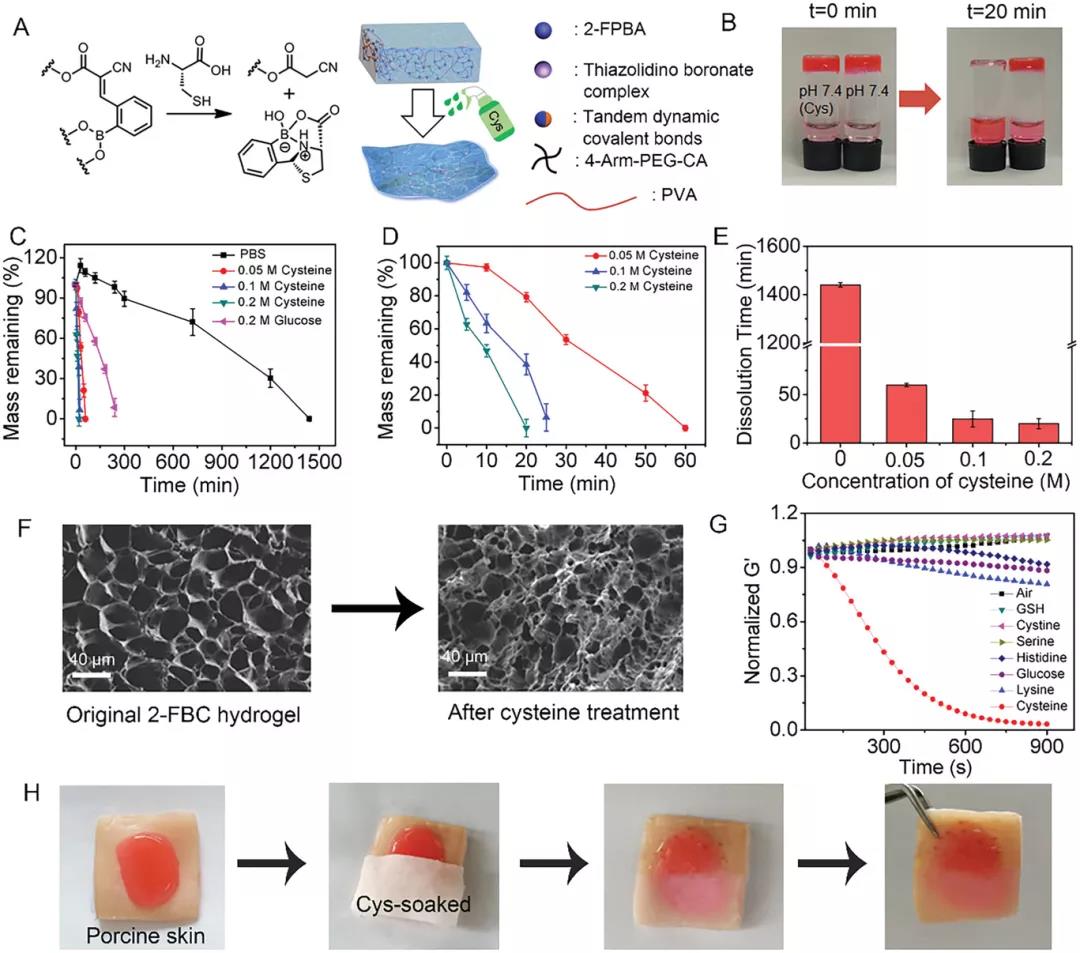 圖2,通過2-FPBA介導的三組分縮合制備可注射的自愈水凝膠并進行表征。A)由4臂PEG-CA,PVA和2-FPBA形成的水凝膠。B)在37°C下不同濃度下的2-FBC水凝膠的儲能模量(G)和損耗模量(Gʺ)。C)在37°C時10%2-FBC水凝膠的剪切應力掃描測試。D)10%2-FBC水凝膠的粘度。E)10%2-FBC水凝膠可注射性。F)在室溫下以1%和500%的交替應變評估10%2-FBC水凝膠的自愈能力。G)2-FBC水凝膠自愈過程。【半胱氨酸誘導2-FBC水凝膠溶解】半胱氨酸處理20分鐘后,2-FBC水凝膠完全溶解(圖 3B)。將半胱氨酸的濃度從0增加到0.2 M導致降解速率增加,溶解時間從1440減少至20分鐘。若加入葡萄糖可加速降解,這可能是由于葡萄糖誘導的串聯動態共價鍵中的硼酸酯鍵解離。SEM圖像顯示,溶液后,水凝膠的孔變得更小,更不規則,表明水凝膠網絡被破壞。接下來,作者研究了2-FBC水凝膠在皮膚表面上的按需溶解特性(圖 3H)。將2-FBC水凝膠注入豬皮膚,然后用半胱氨酸浸泡的紗布覆蓋一半的水凝膠。20分鐘后,被半胱氨酸浸透的紗布覆蓋的部分完全溶解。