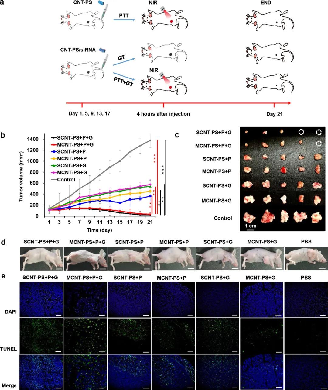 2)CNT/siRNA通過抑制survivin表達(dá)抑制腫瘤生長,同時(shí)在近紅外(NIR)光下表現(xiàn)出光熱效應(yīng)。SCNT-PS/siRNA具有很高的抗腫瘤活性,對(duì)某些腫瘤具有完全抑制作用。由于PL和SL涂層的作用,溫敏的脂質(zhì)發(fā)生了相變,這使得siRNA能夠高效地全身遞送到腫瘤部位,并有助于siRNA的釋放。
