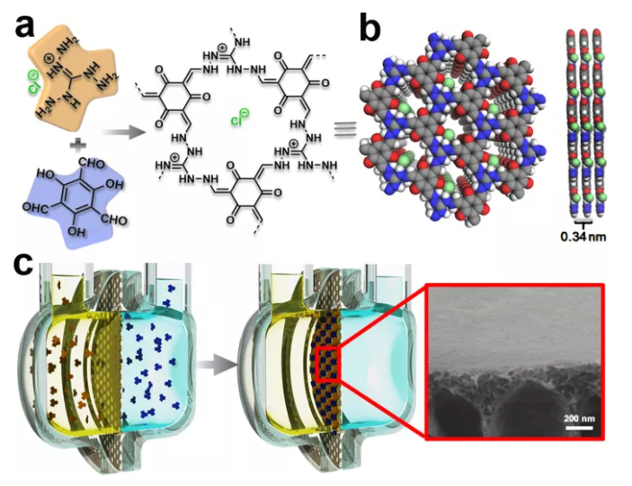 圖1作為仿生溫度計(jì)的離子共價(jià)有機(jī)框架納米流控膜高離子密度有利于產(chǎn)生單極離子環(huán)境,而德拜屏蔽長度是取決于溶液離子強(qiáng)度的特征長度(離子強(qiáng)度越高,德拜長度越小)。因此,COF孔徑越小、荷電密度越高,選擇性更好。為了模仿thermo-TRP離子通道,選用1,3,5-三甲酰基間苯三酚(Tp)與鹽酸三氨基胍(Tag)縮合成的COF作為納米流控系統(tǒng)(Fig.2a,b)。