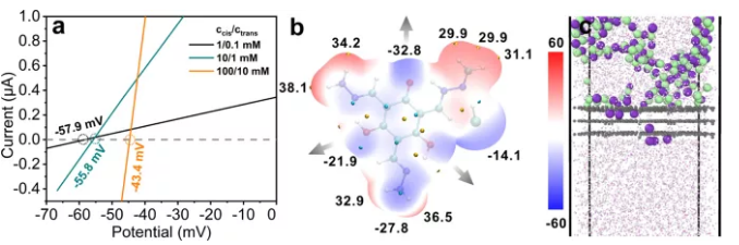 圖2 (a)通過Tp和Tag的縮合合成Tp Tag-COF。(b) Tp Tag-COF的堆疊結(jié)果 (blue, N;灰色,C;紅色;O;白色,H;綠色,Cl)。c Tp Tag-COF/PAN示意圖及SEM圖。【膜的制備和表征】作者采用酸催化界面聚合法制備了COF基膜。PAN作為支撐層,因?yàn)樗怯H水的,帶負(fù)電荷,可以降低陽離子的跨膜能量。在PAN表面有機(jī)相一側(cè)形成了黃色的薄膜,即為COF納米薄膜。掃描電子顯微鏡圖顯示光滑、無裂紋、連續(xù)的薄膜表面,厚度為~100 nm。通過衰減全反射紅外(ATR-IR)分析證實(shí)了COF膜的β-酮烯胺結(jié)構(gòu)的成功形成。在1 mM KCl (pH ~7)的環(huán)境下,Tp Tag-COF/PAN膜和PAN 膜的zeta電位分別為40.88 mV和51.1 mV。對自支撐Tp Tag-COF膜的粉末做x射線衍射,結(jié)果表明在~11°和~28°的2θ值處有兩個相對寬的峰,分別對應(yīng)于(100)和(001)晶面。為了闡明COF骨架的組成,利用Materials Studio進(jìn)行了理論模擬,其c軸孔徑為0.8 nm。為了測定Tp Tag-COF/PAN的選擇性,對不同KCl濃度范圍下的逆轉(zhuǎn)電位進(jìn)行了評估。選擇KCl是因?yàn)镵+和Cl-的遷移率非常相似。當(dāng)cis/trans = 1 mM/0.1 mM、10 mM/1 mM和100 mM/10 mM KCl水溶液時,電流-電壓曲線的X軸截距(Vr)給出了57.9、55.8和43.4 mV的逆轉(zhuǎn)電位(圖3a,cis是指活性COF膜表面)。在100 mM/10 mM NaCl、LiCl、MgSO4濃度梯度下,計(jì)算出Na+/Cl-、Li+/Cl-、Mg2+/SO42-透過率比(選擇性)分別為10、8、3.5。選擇性的差異可以用不同的離子擴(kuò)散速率來解釋。為了進(jìn)一步了解離子的輸運(yùn)行為,作者進(jìn)行了分子動力學(xué)(MD)模擬。Tp Tag-COF層被KCl水溶液和去離子水夾在中間。如圖3所示,表明只有水分子和K+可以移動,從而證實(shí)了K+透過率高于Cl-。