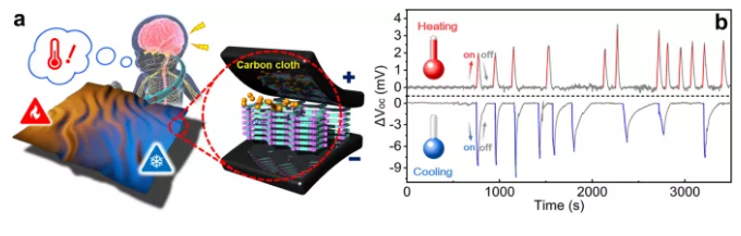 圖5 (a)設(shè)計(jì)具有熱感覺能力的智能紡織品的示意圖。(b)實(shí)時測量電位的變化,對應(yīng)施加的溫度梯度(紅色,加熱;灰色、加熱/冷卻;藍(lán)色,冷卻)。總之,作者制備了COFs膜作為高效熱傳感器,利用膜的離子選擇透過性,證明了COF亞納米通道可以模擬在自然界中觀察到的熱響應(yīng)離子通道。作者表示基于這項(xiàng)研究結(jié)果,目前正在開發(fā)一種能夠檢測環(huán)境溫度的人造皮膚。這項(xiàng)工作在熱敏反應(yīng)器件的發(fā)展中邁出了重要的一步。
