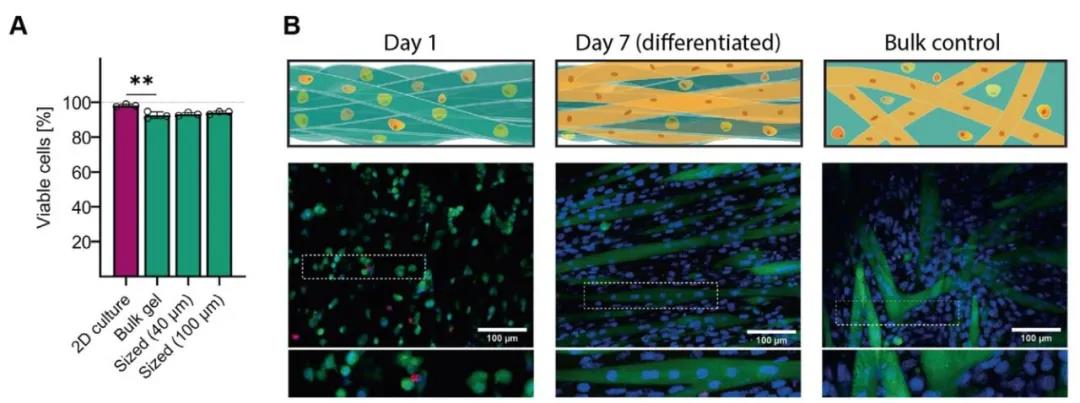 該研究以高縱橫比水凝膠微束為生物墨水,該生物墨水中的凝膠微束相互纏結(jié)形成多孔且穩(wěn)定的凝膠網(wǎng)絡(luò)。且該纏結(jié)微束型凝膠能夠促進(jìn)成肌細(xì)胞的肌管形成,并維持相對較高的細(xì)胞活性(90%)。軟骨細(xì)胞與凝膠微束共沉積打印形成的凝膠支架可誘導(dǎo)軟骨細(xì)胞形成豐富的細(xì)胞外基質(zhì),使其壓縮模量得到顯著地提升。該研究中微束型水凝膠的構(gòu)建策略為3D打印生物墨水提供了一種新型的制備手段。