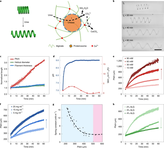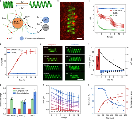 人工細胞樣群落參與多種化學相互作用模式,但與當地環境的接觸極少。最近,英國布里斯托大學Mei Li博士/Stephen Mann院士團隊開發了一種交互式微系統,該系統基于將一群酶活性半透性蛋白體固定在螺旋水凝膠絲內,以實現信號誘導運動。
