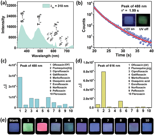 基于發(fā)光氫鍵有機骨架(HOF)的薄膜已成為光學(xué)應(yīng)用中最出色的材料之一,因此,開發(fā)簡便的合成方法并建立基于 HOF 的發(fā)光材料的多功能應(yīng)用至關(guān)重要。最近,同濟大學(xué)閆冰教授團隊成功制備了雙發(fā)射 Eu3+功能化的HOF水凝膠薄膜 (1)。1在關(guān)閉紫外燈時發(fā)出藍綠色長余輝,長余輝壽命達到1.99 s。1對氧氟沙星和氟甲喹的選擇性好、靈敏度高、檢出限低,對氧氟沙星和氟甲喹的檢測符合色度和比值模式。