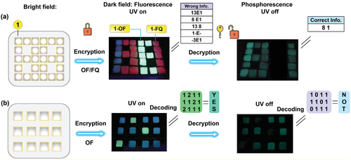 圖5 a) 基于1和1-OF的薄膜防偽陣列,展示了“8”和“6”加解密過程。b) 基于1和1-OF的薄膜防偽陣列,顯示了“YES”和“NOT”加解密和解碼過程。