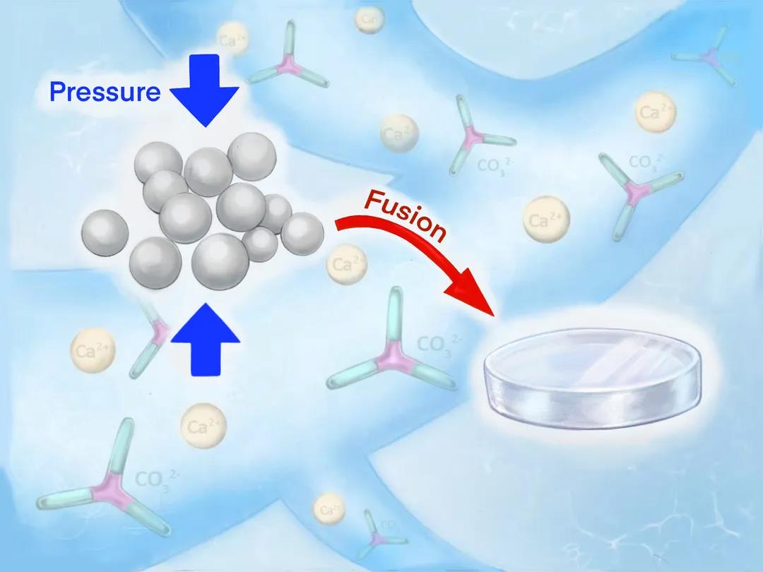 近日,浙江大學化學系劉昭明研究員和唐睿康教授團隊在全球頂級科研期刊《Science》雜志發表了題為“Pressure-driven fusion of amorphous particles intointegrated monoliths (《壓力驅動無定形顆粒融合為塊體材料》”的文章,研究團隊受大自然的啟發,制造出一顆仿生的碳酸鈣“牙齒”。他們通過調控結構水含量與外部壓力,將數百納米尺度的無定形碳酸鈣顆粒成功融合為毫米尺度的具有連續結構的宏觀塊體材料,塊體透明,機械性能與單晶方解石相近。