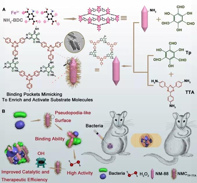 大量研究報(bào)道金屬有機(jī)框架(MOF)結(jié)構(gòu)具有模擬酶的功能,但由于其類酶催化活性較低,因而使得其在催化性能和治療效果方面不能令人滿意。基于此,中科院長(zhǎng)春應(yīng)化所曲曉剛研究員和任勁松研究員等人2021年在Angewandte Chemie International Edition 上發(fā)表了“Nature-Inspired Construction of MOF@COF Nanozyme with Active Sites in Tailored Microenvironment and Pseudopodia-like Surface for Enhanced Bacterial Inhibition”一文,該研究利用源于自然的靈感設(shè)計(jì)并構(gòu)建了具有定制微環(huán)境活性位點(diǎn)和偽足類表面的MOF@COF納米酶(NMCTP-TTA),從而增強(qiáng)納米酶的催化和治療效率。研究中采用“順序生長(zhǎng)”的方法來(lái)合成NMCTP-TTA。首先溶劑熱法制備NM-88并通過席夫堿反應(yīng)形成NM-88-CHO,接著COF共價(jià)連接Tp 和 TTA 構(gòu)建NM-88-CHO,最后將連接到NM-88-CHO上形成NMCTP-TTA。所得到的納米粒子在活性位點(diǎn)周圍形成特定的微孔環(huán)境,通過非共價(jià)相互作用富集和激活底物分子,這種樹杈狀結(jié)構(gòu)納米酶可以如同中性粒細(xì)胞“偽足”樣捕獲細(xì)菌并產(chǎn)生ROS有效地殺死細(xì)菌。
