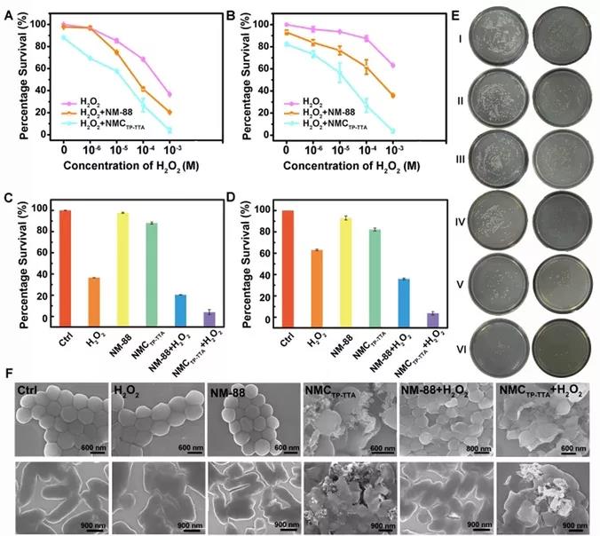 圖2,在不同處理?xiàng)l件下與H2O2共孵育后金黃色葡萄球菌(A)和大腸桿菌(B)的存活率;不同處理后金黃色葡萄球菌(C)和(D)大腸桿菌的存活率;E)不同處理對(duì)金黃色葡萄球菌(左)和大腸桿菌(右)的菌落照片,(I)PBS,(II)H2O2,(III)NM-88,(IV)NMCTp-TTA,(V)NM-88 + H2O2,(VI)NMCTp-TTA+ H2O2;(F)金黃色葡萄球菌和大腸桿菌的SEM圖像。