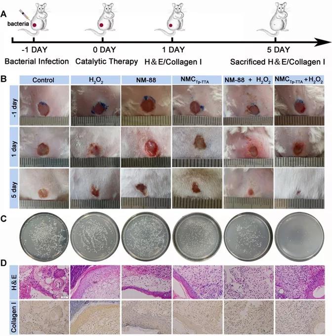 接下來(lái)進(jìn)一步研究MOF@COF的體內(nèi)應(yīng)用。通過采用小鼠傷口感染模型,探索了它們?cè)隗w內(nèi)消除細(xì)菌的潛力。研究人員構(gòu)建金黃色葡萄球菌感染傷口模型,采用不同治療方式。實(shí)驗(yàn)結(jié)果表明,NMCTp-TTA+ H2O2組中出現(xiàn)輕度炎癥和一些膠原蛋白形成,平板計(jì)數(shù)定量分析發(fā)現(xiàn)NMCTp-TTA+ H2O2組的菌落最少(圖3 C,D)。治療5天后,NMCTp-TTA+ H2O2組表現(xiàn)出最佳的傷口愈合效果,且傷口面積最小(圖3 B)。因此可以得出結(jié)論,COFTp-TTA可以增強(qiáng)NM-88納米酶的催化和治療性能,并表現(xiàn)出令人欣慰的抗菌效果。