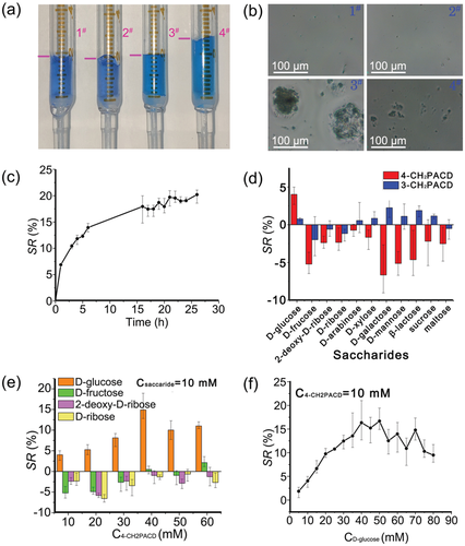雙齒 β-CD 通過三個簡單的反應(yīng)很容易合成,從 DMβCD 和對(溴甲基)苯基硼酸開始。雙齒β-CD的形成過程被發(fā)現(xiàn)是尺寸選擇性的,因為從間(溴甲基)苯基硼酸試劑中,不能提供雙齒β-CD衍生物。雙齒 β-CD(即 4-CH2PACD)包含葡萄糖狹縫,并顯示出與 D-葡萄糖的高效特異性結(jié)合。合成的 4-CH2PACD 被摻雜到 PAAm 水凝膠中,賦予水凝膠對 D-葡萄糖的特異性反應(yīng)。具體而言,當凝膠在 D-葡萄糖溶液中平衡時,水凝膠的膨脹是可見的,而在 D-葡萄糖異構(gòu)體(如 D-果糖和 D-半乳糖)溶液中則收縮。發(fā)現(xiàn)這種特征有利于自我調(diào)節(jié)的特定葡萄糖響應(yīng)性胰島素釋放,因為溶液中高濃度的 D-葡萄糖會導(dǎo)致凝膠膨脹并增加網(wǎng)格尺寸。體內(nèi)試驗表明,在 T1DM 中預(yù)加載雙齒 β-CD 和短活性胰島素的 PAAm 水凝膠能夠?qū)崿F(xiàn)長期持續(xù)的血糖控制。預(yù)計這種簡便的合成方法將為雙齒 β-CD 作為各種重要生物化合物或代謝物的受體的合成打開一扇新的大門?紤]到 β-CD 與許多生物或藥物活性化合物之間的多功能主客體內(nèi)含物,以及雙齒 β-CD 與靶向生物分子之間的特定相互作用,為 DSGTIR 開發(fā)了一種新機制。