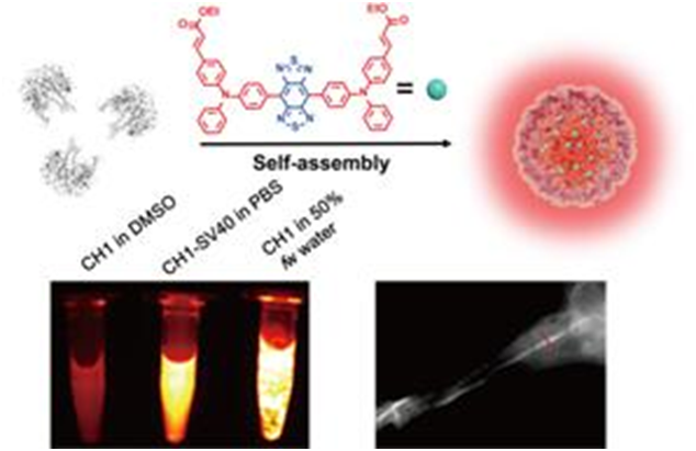 具有分子內(nèi)扭轉(zhuǎn)電荷轉(zhuǎn)移(twisted intramolecular charge-transfer,TICT)和聚集誘導(dǎo)發(fā)光(aggregation-induced emission,AIE)性質(zhì)的近紅外Ⅱ區(qū)有機(jī)熒光納米顆粒,作為新型活體熒光成像探針,具有高信噪比、高時(shí)空分辨等優(yōu)點(diǎn),但現(xiàn)有技術(shù)制備的有機(jī)納米顆粒存在粒徑難以精確控制、穩(wěn)定性和生物相容性差等問(wèn)題。針對(duì)該問(wèn)題,李峰課題組與合作者利用雜合組裝策略,將TICT-AIE分子(CH1)包裝在SV40 VLP內(nèi)腔,構(gòu)建了粒徑均一(約21 nm)、高生物相容性和光穩(wěn)定性的雜合有機(jī)納米顆粒CH1-SV40,熒光量子產(chǎn)率高達(dá)13.03%;利用CH1-SV40成功實(shí)現(xiàn)了血管成像和影像引導(dǎo)的腫瘤切除手術(shù)。該工作為生物醫(yī)學(xué)近紅外II區(qū)成像提供了新型納米探針(圖2),也為可控構(gòu)建有機(jī)納米顆粒提供了新思路。相關(guān)成果發(fā)表于ACS Appl. Mater. Interfaces(DOI:10.1021/acsami.1c02691)。中南民族大學(xué)閔雪紅博士、武漢病毒所博士生張娟和中南民族大學(xué)碩士生李潤(rùn)豪為該論文的共同第一作者,武漢病毒所李峰研究員和中南民族大學(xué)孫躍教授為論文共同通訊作者。