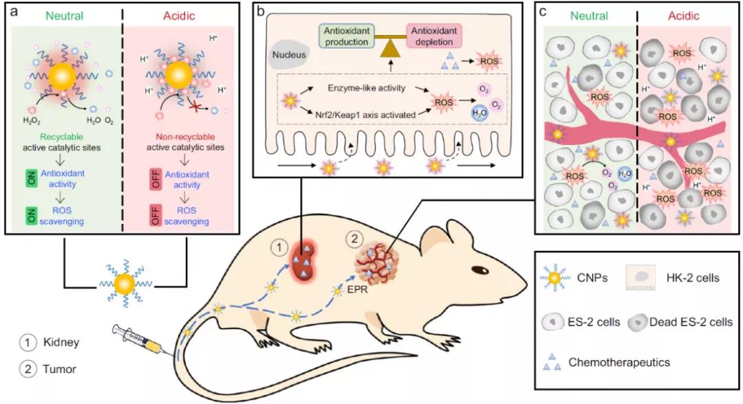 鑒于此,浙江大學凌代舜課題組在《Nature Communication》上發表了Catalytic activity tunable ceria nanoparticles prevent chemotherapy-induced acute kidney injury without interference with chemotherapeutics為題的研究,該研究設計了一種催化活性可調的二氧化鈰納米粒子(CNPs),可以防止化療引起的 AKI,但不會干擾化療作用。具體來說,在腎皮層中性環境中CNP催化分解H2O2,然后通過激活Nrf2/Keap1信號通路來調節與ROS有關的基因表達,恢復ROS平衡保護腎小管;在腫瘤酸性微環境下,CNP由于高濃度的H+破壞了其活性催化位點進而限制其的抗氧化作用,從而不干擾化療生成的ROS來殺死癌細胞。作為 ROS調節劑,CNP這種條件依賴型可調的催化活性,在癌癥患者的 AKI 臨床預防和治療方面具有巨大潛力。