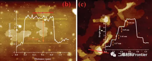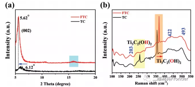 用原子力顯微鏡比較了TC和FTC的厚度(AFM,圖2b,c)。TC顯示了完整的單層Ti3C2Tx(T=-F,-O,-OH,表面的懸浮部分)結構 厚度約為2.91nm,相當于5個單原子層的厚度;FTC的AFM光譜顯示了一個層狀結構,其平均層間間距擴大了3.42nm。