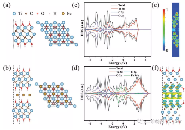如圖5所示,a的TC和b的FTC結構模型的側面(左)和頂部(右)視圖,其中藍色、棕色、紅色、灰色、金分別對應于Ti、C、O、H、Fe。c圖和d圖分別是TC、FTC的狀態密度。e圖是FTC(110)平面的平面內電子定位函數(ELF)映射。f圖是FTC的差分電荷密度。等位面設置為0.01eA−3。藍色表示電子消散,黃色表示電子聚集。