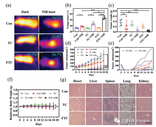 2DMXene,Ti3C2(TC),由于其生物相容性和優異的光熱轉化能力,在光熱治療(PTT)中顯示出了巨大的應用潛力。然而,由于單藥治療的基本缺陷和復雜的腫瘤微環境(TME),一些腫瘤消融很難通過單藥治療完全實現。在這篇文章中,作者將適當的摻雜的Fe2+離子固定在二維超薄TC納米片層中,通過層間靜電吸附,合成了一種新型的Fe(II)-Ti3C2(FTC)多功能納米殼。