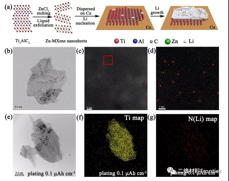 圖 1. a) 固定在 MXene 層 (ZnMXene) 上用于鋰成核和生長(zhǎng)的單個(gè)鋅原子的合成過(guò)程。b) Zn-MXene 納米片的典型 TEM 圖像,顯示出透明特征。c, d) HAADF-STEM圖像,顯示了高密度的亮點(diǎn)(鋅原子)在MXene納米片。e)氮標(biāo)記后Zn-MXene-Li層在0.1 μAh cm-2電鍍水平下的STEM圖像。相關(guān)元素f) Ti和g) N (Li)的分布,表明Li在ZnMXene層上呈均勻形核。