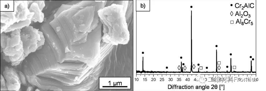 圖a)是粉末顆粒掃描圖、圖b)是Cr2AlC粉末的XRD圖。