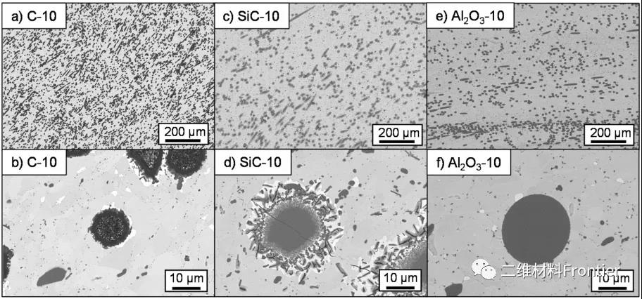 上圖中,a)是含10wt%的復合材料;b)是碳纖維;圖c)和d)是碳化硅纖維;圖e)和圖f)是氧化鋁纖維的概述和詳細視圖。