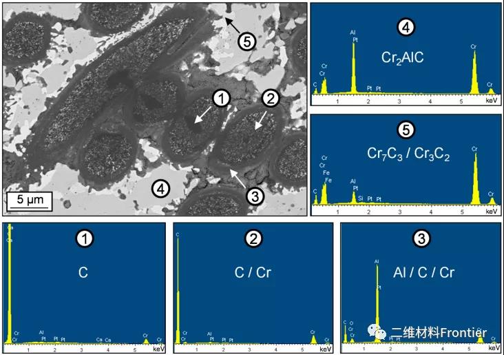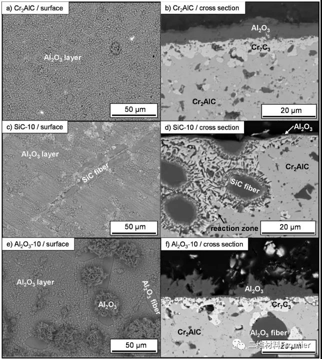 本研究最重要的結果是Al2O3-10在現實氧化環境中的氧化反應。在1200℃下形成500次循環的保護性、粘附良好的氧化鋁層和C纖維在這次測試中存活下來,沒有任何損傷或可見的顆粒生長。在氧化鋁層的下面形成了Cr7C3層。總的來說,本實驗結果對進一步發展陶瓷纖維max相材料非常有前景。