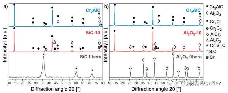 圖4.)Cr2AlC、Al2O3-10、氧化鋁纖維、SiC-10和碳化硅纖維的衍射圖。