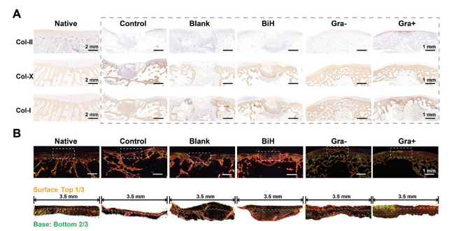 分層骨軟骨缺損的修復需要復雜的梯度重建;然而,很少有連續梯度鑄造的策略考慮到與臨床實際有關的細胞適應性、多個梯度元素和精確的梯度鏡像原生組織。在這里,利用合成的超順磁性HA納米棒(MagHA)開發了一種具有納米羥基磷灰石(HA)、力學和磁性連續梯度的水凝膠,該納米棒易于對磁場做出響應。根據健康兔膝關節的磁共振成像(MRI)計算出優化的精確重建骨軟骨組織梯度模式。然后,MagHA形成連續的生物理化梯度,從而在外部磁刺激下產生增量HA、機械和電磁信號。為了使這種依賴深度的物體起作用,開發了一種適應性強的水凝膠來促進細胞滲透。將該方法應用于兔全層骨軟骨缺損的局部磁場修復,這種多層梯度復合水凝膠以完美的異質特征修復骨軟骨單元,模仿軟骨向軟骨下的逐漸過渡。