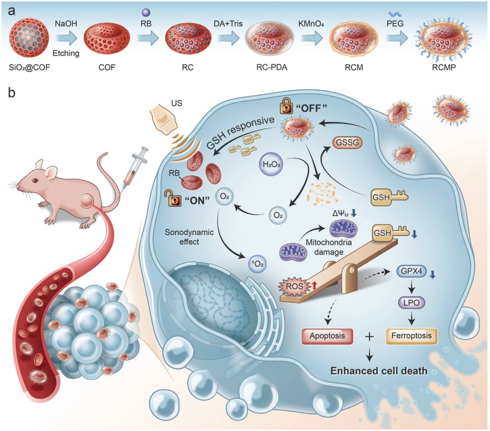共價有機框架(COFs)在生物醫學領域的應用越來越受到人們的關注。以COFs為基礎的納米增敏劑具有均勻的納米級形態和腫瘤特異性療效,然而,它們的合成仍然具有挑戰性。在本研究中,以可控的方式合成了不同的COF納米碗,并設計成具有腫瘤特異性聲動力學活性的可激活納米增敏劑。高結晶度保證了COF納米碗的有序多孔結構,從而有效地裝載了小分子聲敏劑Rose Bengal (RB)。為了避免對正常組織的非特異性損傷,在負載RB的COFs上原位生長的氧化錳(MnOx)特異性地抑制了聲敏化效應。與腫瘤過表達谷胱甘肽(GSH)反應后,“看門人”MnOx在超聲照射下迅速分解,恢復COF納米增敏劑的活性氧(ROS)生成能力。增加細胞內活性氧應激和谷胱甘肽消耗同時誘導鐵死亡,以提高聲動力功效。此外,非常規的碗狀形態使納米致敏劑增強了腫瘤的積聚和保留。腫瘤特異性聲動力治療與鐵死亡相結合,在殺傷癌細胞和抑制腫瘤生長方面具有很高的療效。