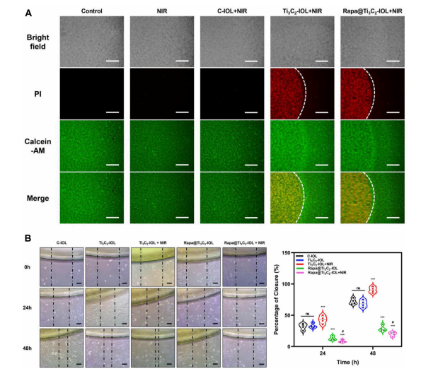 在這里,將Rapa@Ti3C2涂在IOL的光學部分表面,即Rapa@Ti3C2-IOL上,用于聯合PTT和NIR可控藥物釋放療法預防PCO。該Rapa@Ti3C2-IOL體系具有與商業疏水IOL較高的透光率、中等折射率和相當的應變應力和拉伸特性。由于Ti3C2的高光熱轉換效率,Rapa在808 nm NIR照射下實現了Rapa的可控釋放行為。NIR觸發的Rapa釋放有利于抑制光熱治療后LECs的遷移,抑制炎癥反應。Rapa@Ti3C2-IOL的協同治療研究表明,在體內外均具有良好的LECs殺傷能力和PCO預防能力。此外,Rapa@Ti3C2- IOL對其他眼內組織的毒性可以忽略不計,這使得它有望在臨床轉化中得到應用。這種具有優異的治療效率和高生物相容性的Rapa@Ti3C2-IOL納米系統可能作為一種很有前途的預防PCO的策略。
