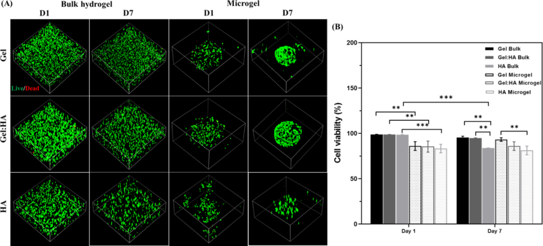 為了評估水凝膠組成和幾何結構在生物學功能上的相互作用,作者評估了不同水凝膠組成在塊狀和微凝膠形態下支持hBMSC培養的能力。將hBMSCs以塊狀和微凝膠的形式封裝,在基礎培養基中培養1天和7天后,通過活/死染色評估細胞存活率。包封后24小時和培養7天,三種成分的塊狀水凝膠和微凝膠的細胞存活率均超過85%。HA水凝膠可以歸因于在透明質酸單獨水凝膠中缺乏細胞黏附和擴散,這是錨定依賴細胞如間充質干細胞生存和生長所必需的。這些圖像也提供了細胞分布的初步指示,其中間充質干細胞呈圓形分布在第1天上的微凝膠中,但遷移到微凝膠的外圍并在第7天前擴散,從而使熒光更加強烈(圖5)。