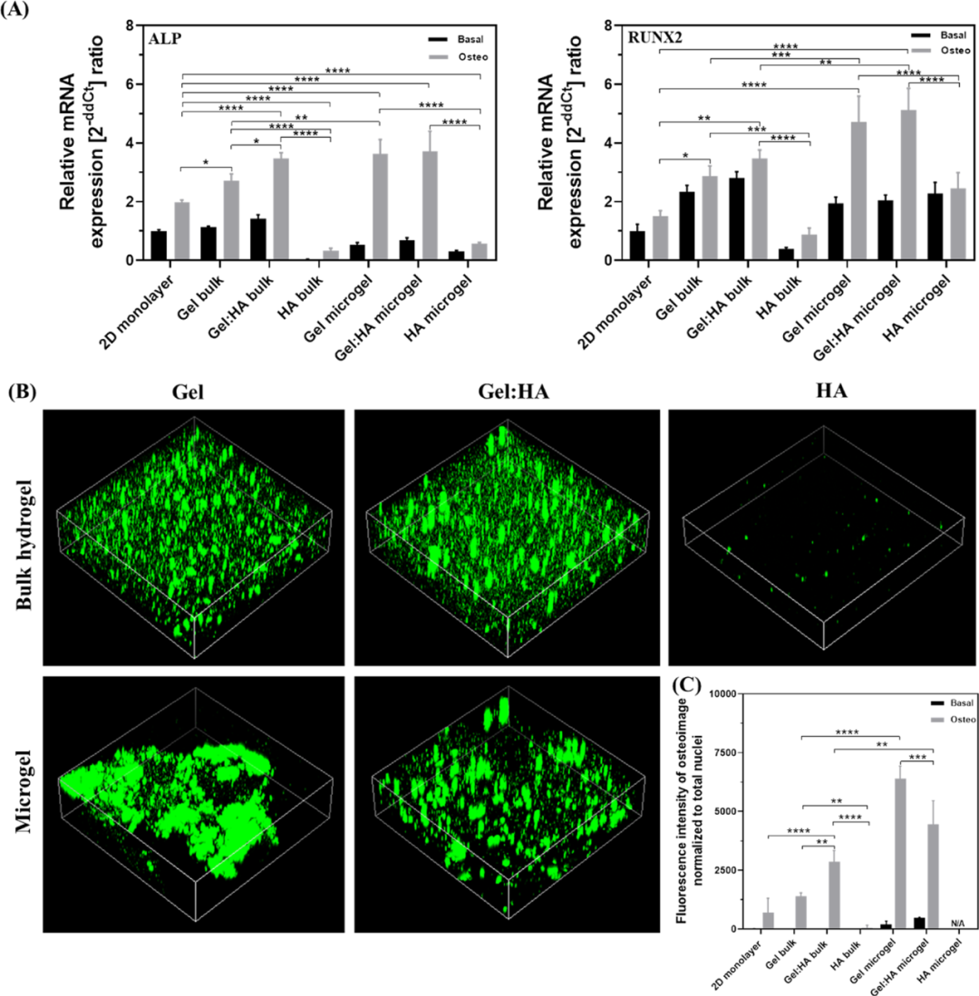 為了確定水凝膠組成和幾何形狀對間充質干細胞分化的影響,所有組成的體積水凝膠和微凝膠均在基礎培養基和骨誘導培養基中培養7天。與基礎培養相比,骨誘導培養中ALP和RUNX2基因表達明顯上調,表明hBMSC成功分化為成骨細胞系。此外,Gel和Gel:HA內的hBMSC成骨誘導培養中ALP和RUNX2的表達明顯高于2D單層細胞培養。這強調了3D平臺相對于2D平臺的優勢。相反,HA水凝膠不支持成骨。同樣的,與塊狀凝膠相比在微凝膠中ALP表達也明顯增高(圖7)。
