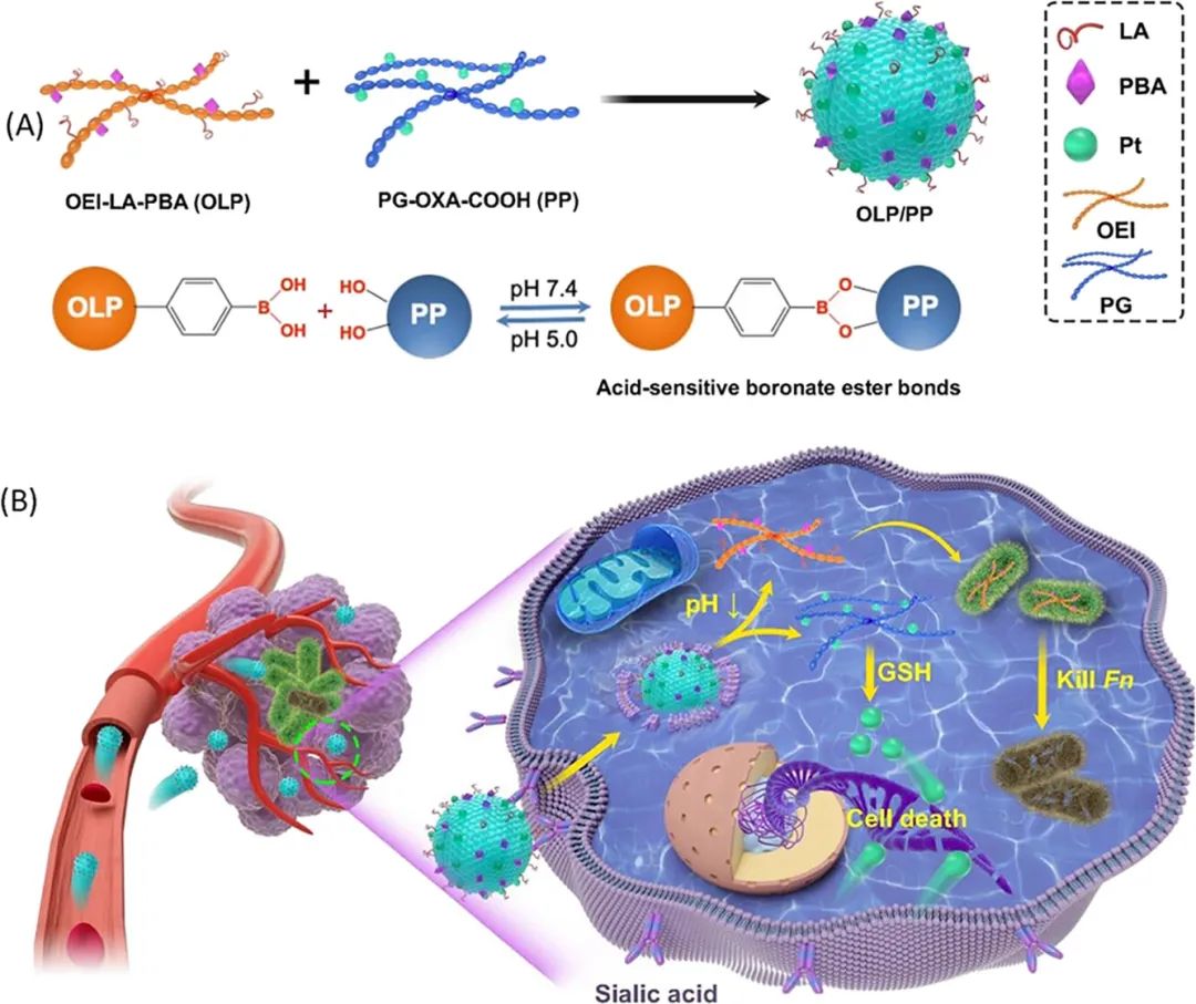 結(jié)直腸癌(CRC)是一種常見的消化道惡性腫瘤,其發(fā)病率和死亡率居高不下。具核梭桿菌(Fusobacterium nucleatum,F(xiàn)n)是一種常見的口腔厭氧桿菌,它可以通過(guò)黏附、侵入、調(diào)節(jié)免疫、誘導(dǎo)遺傳變異等方式促進(jìn)CRC的發(fā)生和轉(zhuǎn)移,并且降低癌細(xì)胞對(duì)化療藥物的反應(yīng),與結(jié)直腸癌(colorectal cancer,CRC)的發(fā)生發(fā)展有著密切的關(guān)聯(lián)。研究發(fā)現(xiàn),F(xiàn)n可以通過(guò)多種機(jī)制促進(jìn)結(jié)直腸腫瘤的形成和進(jìn)展,并且影響癌癥對(duì)化療藥物的敏感性。因此,如何有效地清除腫瘤內(nèi)的Fn并克服化學(xué)耐藥性是當(dāng)前防治CRC的一個(gè)重要課題。為了增強(qiáng)癌癥的治療效果,開發(fā)了一種能夠靶向腫瘤酸度并消滅腫瘤內(nèi)具核梭桿菌(Fn)的活性納米材料。首先將月桂酸和苯基硼酸與低聚亞甲基亞胺連接,制備出 OLP,然后將其與修飾了奧沙利鉑前體的聚縮水甘油醚 (PP) 結(jié)合,得到 OLP/PP 納米組裝體。該納米組裝體在模擬生理?xiàng)l件下具有良好的穩(wěn)定性,在腫瘤微環(huán)境中的酸性條件下能夠釋放藥物。更重要的是,該納米組裝體能夠特異性地識(shí)別腫瘤細(xì)胞,并促進(jìn)細(xì)胞攝取,從而有效清除腫瘤內(nèi)外的Fn。通過(guò)這種方式,納米組裝體能夠克服化學(xué)耐藥性,并顯著抑制腫瘤的生長(zhǎng)。體外和體內(nèi)實(shí)驗(yàn)都證明了該納米組裝體的生物相容性。因此,這種具有高效抗菌和抗腫瘤功能的生物相容性納米組裝體為治療Fn感染的腫瘤提供了新的策略。