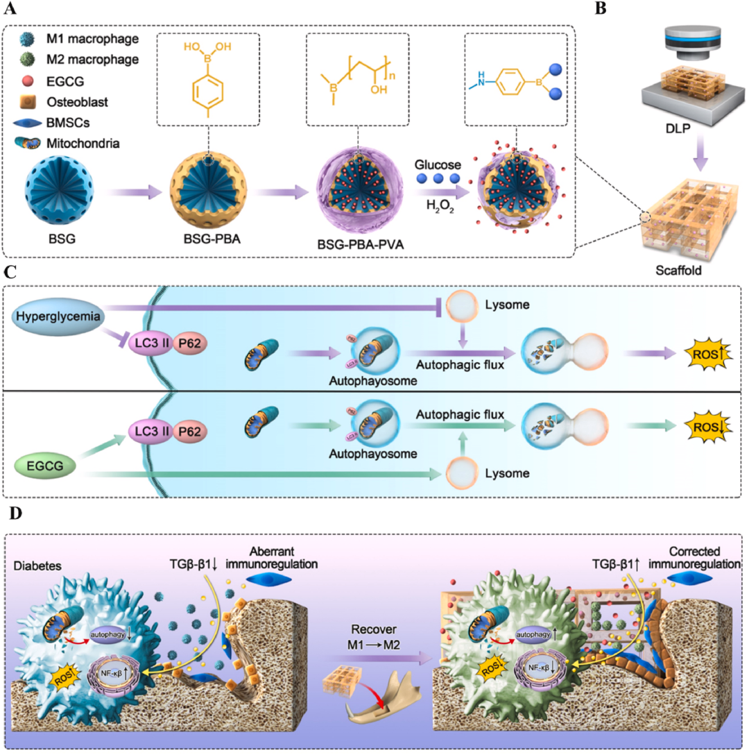 為了促進(jìn)糖尿病牙槽骨缺損的再生,開發(fā)了一種基于表沒食子兒茶素沒食子酸酯 (EGCG) 的葡萄糖和過(guò)氧化氫雙重響應(yīng)硼硅酸鹽玻璃 (BSG) 支架,該支架可以協(xié)同調(diào)節(jié)牙槽骨缺損部位的異常炎癥反應(yīng)。EGCG是一種從茶葉中提取的天然多酚類化合物,具有抗氧化、抗炎、抗腫瘤等多種生物活性。BSG是一種具有生物活性和可降解性的無(wú)機(jī)材料,可以作為藥物或生長(zhǎng)因子的載體。研究人員將EGCG封裝在BSG支架中,形成EGCG-BSG復(fù)合支架,該支架可以根據(jù)葡萄糖和過(guò)氧化氫的水平調(diào)節(jié)EGCG的釋放速度和量,從而實(shí)現(xiàn)對(duì)炎癥環(huán)境的智能適應(yīng)。