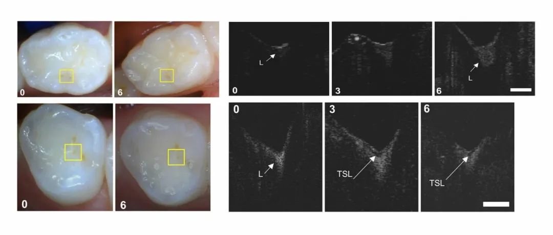 在招募的30名受試者中,29名受試者完成了研究。監測每例受試者的兩顆牙齒上的疑似病變。其余58處病變中的6處被確定為完好,因為在任何時間點的CP‐OCT圖像中均未發現病變。另外10處病變由于無法在所有3個時間點對CP-OCT病變進行配準而被取消,CP-OCT樣本量為42處病變。