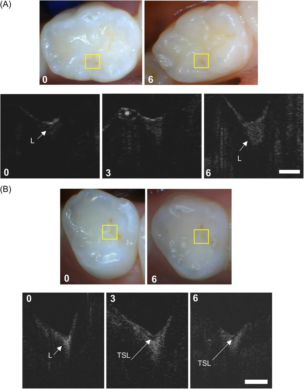 目前需要新的非破壞性診斷工具,能在單次觀察中評估病變活動性,并在非手術干預期間監測病變活動性隨時間的變化。研究表明,短波紅外(SWIR)成像方法,如1310 nm的光學相干斷層掃描(OCT)和波長大于1400 nm的時間分辨反射成像,可用于評估再礦化和病變活動性。光學相干斷層掃描可提供病變結構的高分辨率橫截面圖像。偏振敏感光學相干斷層掃描(PS‐OCT)和交叉偏振光學相干斷層掃描(CP‐OCT)利用背反射光的偏振特性,在光學相干斷層掃描圖像中獲得額外的對比度,并減少發生在牙齒表面的強反射的干擾。使用CP‐OCT的體內研究能夠準確檢測早期和嚴重的咬合病變,這些病變在X光片上不可見。CP-OCT能夠通過檢測病變表面高度礦化透明表面層(TSL)的形成以及暴露于再礦化溶液后損傷深度(ΔR)上的綜合反射率的降低來監測牙齒表面的再礦化。