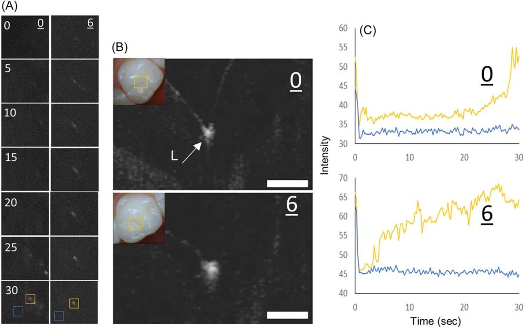 圖4.(A)干燥過程中0和6個月時0 - 30 s病變區域的SWIR圖像(病變區域在黃色框中,健全區域在藍色框中)(B)0個月和6個月時的CP-OCT小窩溝病變圖像 (C) SWIR反射強度隨時間的變化曲線