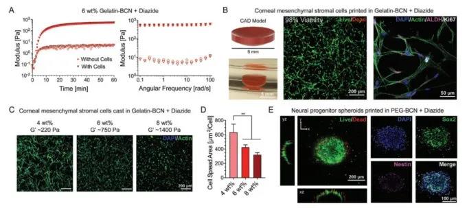 In addition, the key to the adaptability of the universal bio-ink system is its customization ability to match the required bioprinting application. Therefore, the researchers also constructed cell culture scaffolds based on the matrix mechanical properties of different cell types, verifying that corneal stromal cells, neural precursor cells, etc. still maintain good viability and functional expression in the bio-ink material. Prove that the bio-orthogonal cross-linked bio-ink does not cross-react with other bio-molecules, including bio-molecules that exist on the cell surface, the culture medium or the ink itself, which makes it a universal strategy.