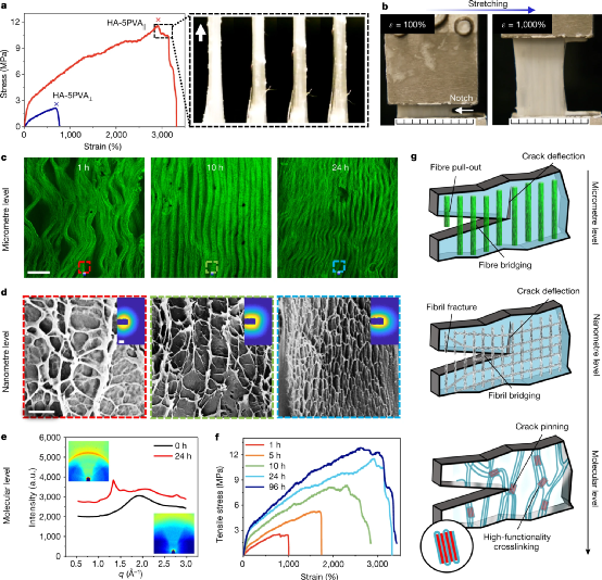 In view of this, Professor He Ximin of the University of California, Los Angeles and others have adopted a combination of molecular and structural engineering methods that have not been used before, that is, the strategy of using freezing-assisted salting-out treatment to produce multi-length-scale layered hydrogel structures. Prepare the hydrogel. The synthetic biomaterials prepared by this new method can mimic the internal structure, stretchability, strength and durability of tendons and other biological tissues.