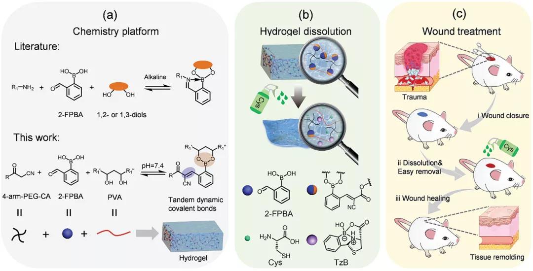 Academician Chen Xuesi and associate researcher Xiao Chunsheng of Changchun Institute of Applied Chemistry developed tandem dynamic covalent bonds based on 2-formylphenylboronic acid (2-FPBA), including the dynamics of uncatalyzed Knoevenagel condensation (CKC) reaction and formation of borate esters. The C=C double bond is used to construct an on-demand injectable hydrogel (process 1A). The hydrogel was prepared by mixing 2-FPBA with cyanoacetate end-functionalized 4-arm PEG (4-arm PEG-CA) and polyvinyl alcohol (PVA). Due to the tandem dynamic covalent bond, the resulting hydrogel is injectable. In the presence of cysteine, the hydrogel rapidly dissolves by forming a thiazolidine borate (TzB) complex (Scheme 1B). This hydrogel can be used as a dressing for wound treatment, and achieves rapid wound closure and on-demand dissolution (Scheme 1C). The article "Injectable Self-Healing Hydrogel Wound Dressing with Cysteine-Specific On-Demand Dissolution Property Based on Tandem Dynamic Covalent Bonds" was published on "Advanced Functional Materials".