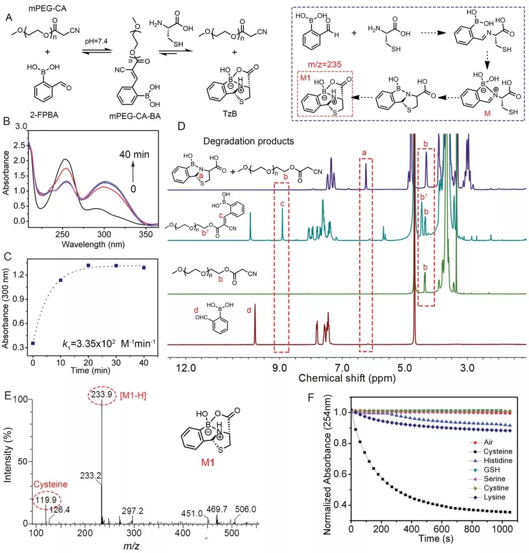 The author first measured the UV-vis spectrum to confirm the proposed mechanism of the reaction between cysteine and 2-FPBA. The new peak at 300 nm was attributed to the formation of the C=C double bond, indicating the reaction kinetics of the CKC reaction; Cystine greatly reduces the absorbance values at 300 and 254 nm, indicating that cysteine can quickly decompose mPEG-CA-BA (Figure 1C). 1H NMR confirmed that mPEG-CA reacted with 2-FPBA to form new conjugates mPEG-CA-BA and the dissociation of mPEG-CA-BA (Figure 1D). In addition, the coexistence of the reactant (mPEG-CA and 2-FPBA) and the product (mPEG-CA-BA) indicates that the C=C double bond is a dynamic covalent bond. ESI-MS and FTIR spectra confirmed the formation of TzB complexes (Figure 1E-F). These results indicate that the dynamic C=C double bond formed by the conjugation of mPEG-CA and 2-FPBA can be specifically dissociated by cysteine.