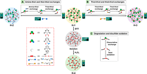 Schematic 2. schematic diagram of covalent adaptation of various hydrogels based on amine thiol / thiol mercaptan interference, uncoupling reaction and thiol two sulfides oxidation: (A) PEG two amine induced chemical bond disconnection and reconnection in H-, 1 matrix exchange through amine thiol and thiol thiol to generate H-2. (B) The chemical bond breaking and reconnection in H-1 matrix induced by PEG dithiol can obtain H-3 through mercaptan mercaptan exchange, and (c) DTT induced chemical bond breaking and hydrogen peroxide induced reconnection can produce H-4