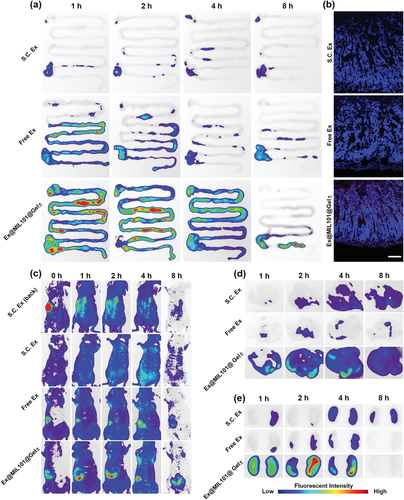 Fig. 3a) subcutaneous injection of exendin-4 (SC Ex), jejunal injection of exendin-4 (free Ex) or jejunal injection Ex@MIL101 @The in vivo and in vitro fluorescence images of BALB / C nude mice intestines after gel were observed at different time points. b) CLSM images of intestinal tissue sections 2 hours after administration of three kinds of exendin-4. The fluorescence intensity distribution of Rho ex in C) body, d) liver and E) kidney of mice after three kinds of exendin-4 were applied at different time points.